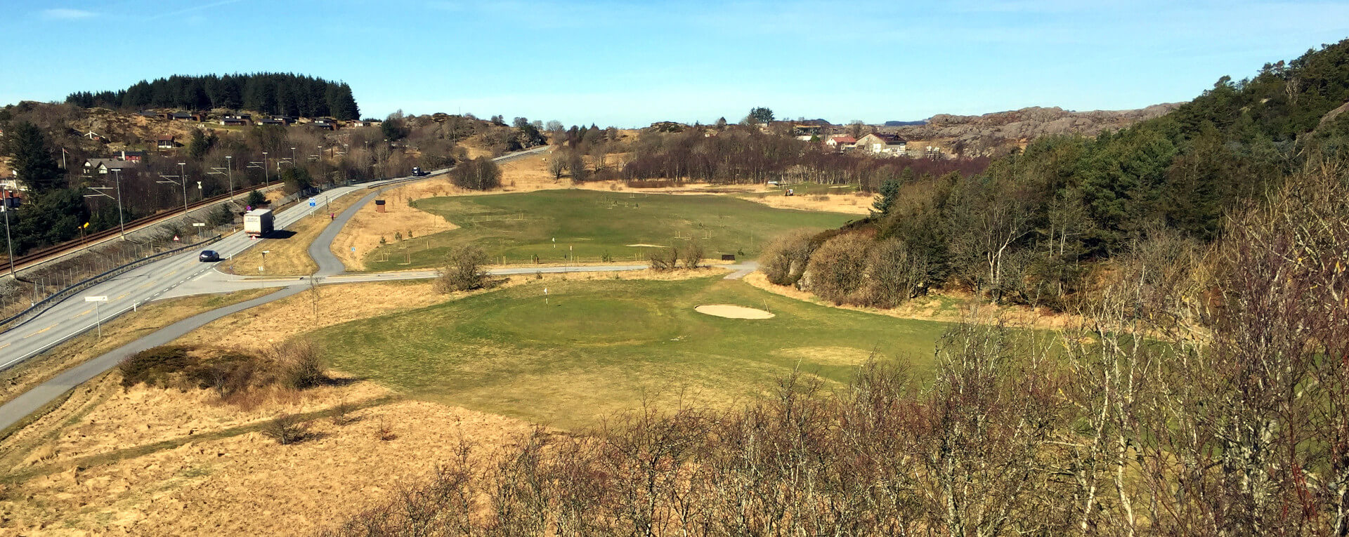 Banen er flott plassert med god livd fra vinden og et landskap som lager en kjempeflott ramme rundt banen.